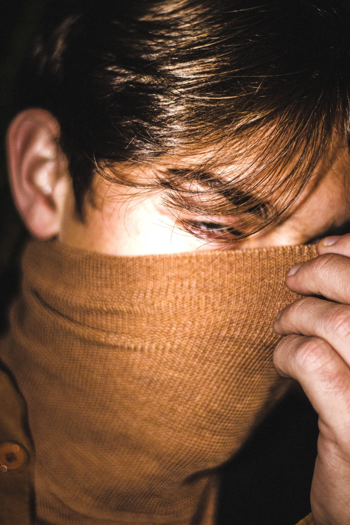 A person with brown hair wearing a brown face covering, partially covering their face, holding their glasses with their right hand.