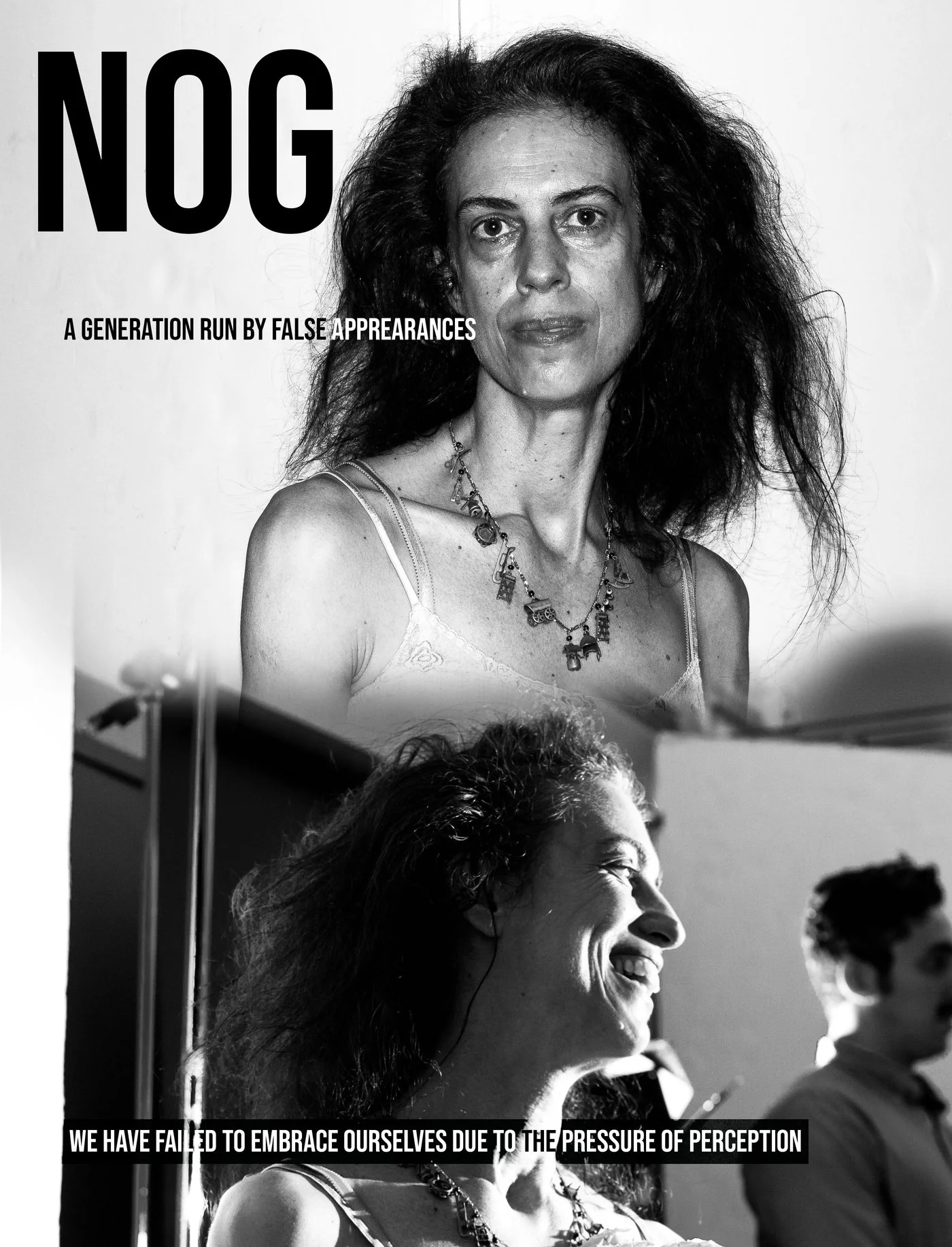 Black and white photo of a woman with wild hair wearing a necklace and a tank top, with the text "NOG: A Generation Run by False Appearances" and a quote saying "We have failed to embrace ourselves due to the pressure of perception".
